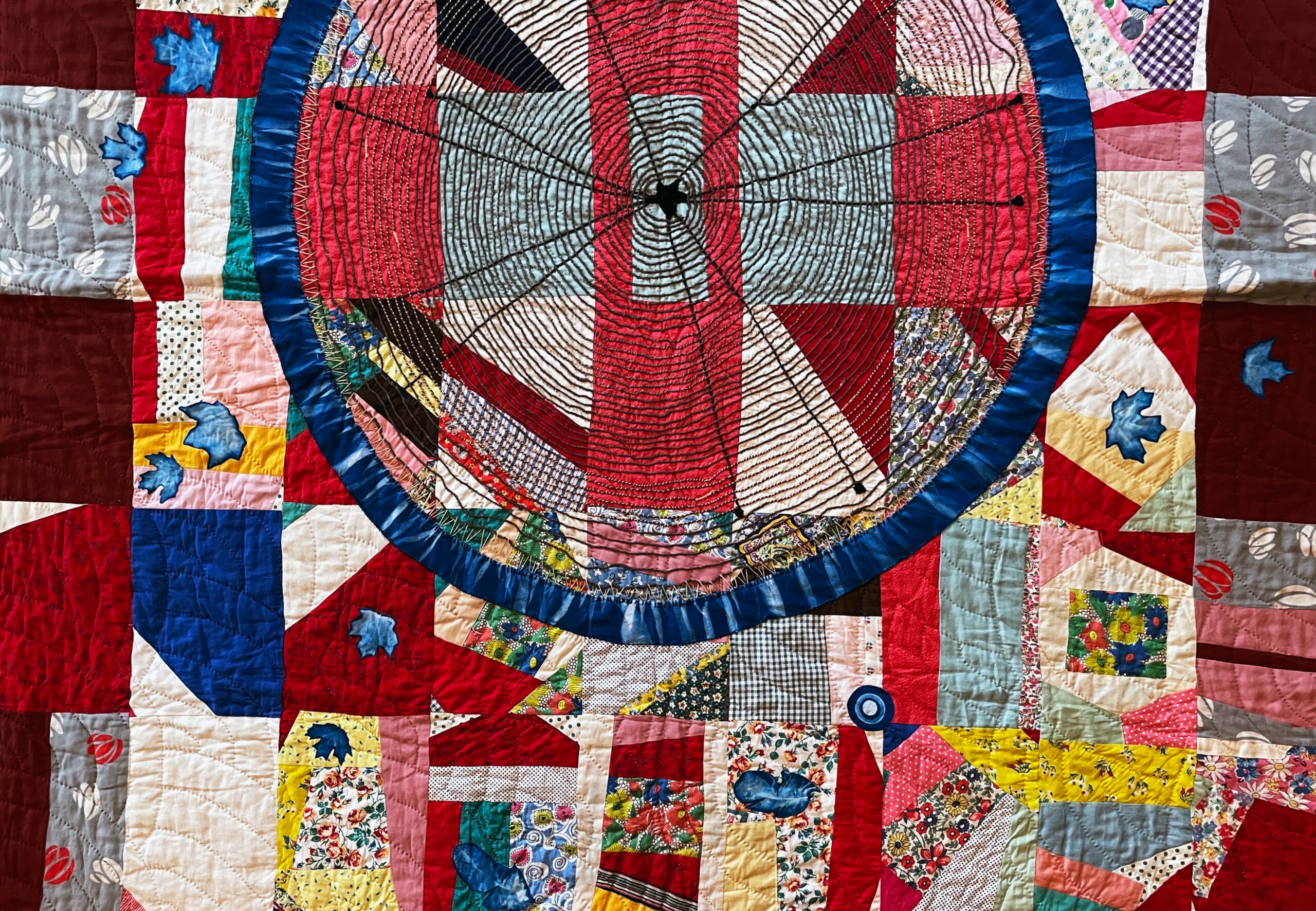 Without exception is the quilt piece, The Optimistic Denrophile. A piece that pays homage to the very healthy 218-year-old sugar maple rooted in my front yard. When the tree sprouted in Springfield, Kentucky, Abraham Lincoln was born just a few miles away, possibly the same year. Somehow it survived the Civil War and in 1871—a house was built beside it. Now my house. Currently, with a circumference of 125″ and a 40″ diameter it is a monolithic inspiration in my life. The fabric cyanotype maple leaves and trunk embellish this vintage crazy quilt along with surprises and many stitches— all to represent the years of its long life. Clearly an assemblage!